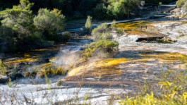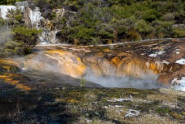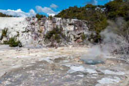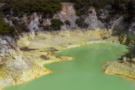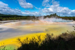 Nicht ganz so voll war es nebenan, im Wai-O-Tapu Valley. Wir sahen die größten Sinterterrassen Neuseelands, Krater ohne Ende in gelb, rot und lila und dampfende und blubbernde Becken. Die riechenden unter uns hielten es hier kaum aus und so schlenderten wir weniger entspannt herum, als sonst. Besonders gut fanden wir den Champagner Pool in seinen Regenbogenfarben und dem roten Rand und ein neongrün-gelbes (für Vici ganz klar tschitscherin grünes!) Becken.