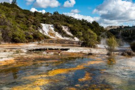 Um dem Geruch nicht gleich wieder nach Rotorua zu folgen, zog es uns gen Süden nach Orakei Korako. Hier wird das kochende Wasser ganz anders in Szene gesetzt. 😊 Nach einer kurzen Fährfahrt konnten wir über Holzstege durch Wald und Sträucher, aber vor allem ganz allein über diese atemberaubenden Farben stapfen. Eingerahmt von Moosen und Farnen sahen weiß, ocker, grün und blau ziemlich unwirklich aus und auf den Wegen ohne Geländer waren wir mittendrin. Aus jeder Ecke hörten wir es zischen, sprudeln, blubbern und plätschern und über allem hing weißer Dampf vom kochend heißen Wasser, das da einfach so aus der Erde kam …
