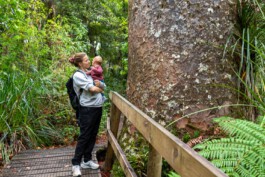 Ein paar Minuten südlich machten wir uns nach dem Mittagessen auf zum zweitgrößten Kauribaum. Das war auch wieder ein tolles Erlebnis, zwischen diesen uralten Riesen hindurch zu wandern. Je weiter wir in den Wald hinein kamen, desto größer und näher standen die Bäume da. Wir wurden wieder über Planken und Stege geführt, weil die Bäume ihre empfindlichen Wurzeln weit auffächern und niemand sie verletzen soll.
